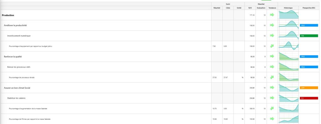 Les tableaux de synthèse permettent de suivre au fil du temps les indicateurs de mesure de la performance et l’atteinte des objectifs assignés.