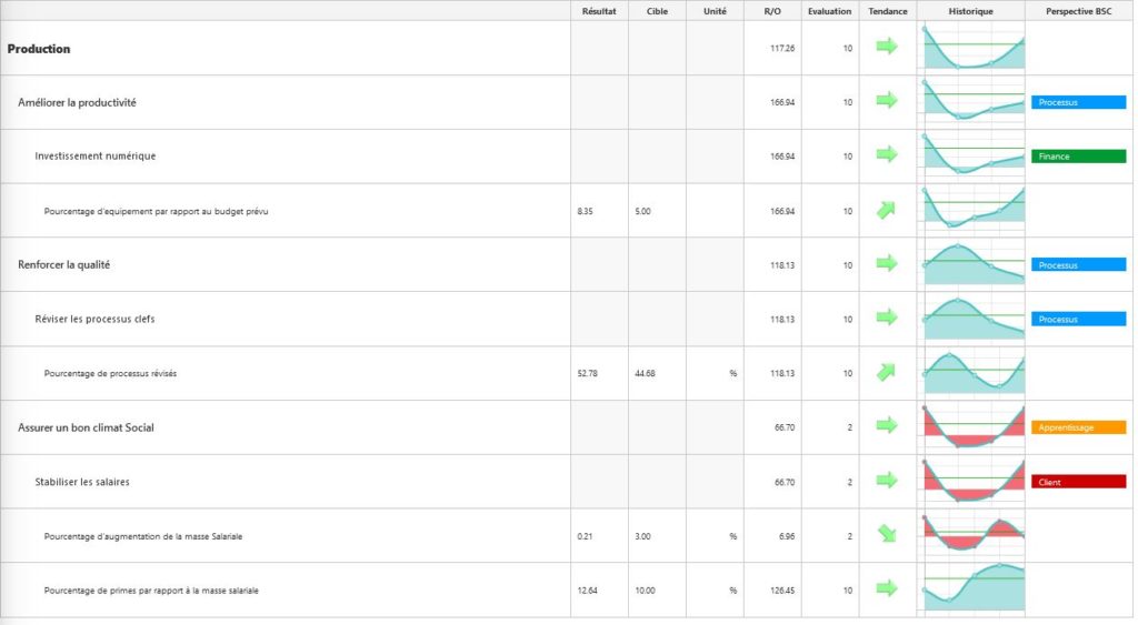 Afin d’impliquer les équipes, les critères retenus doivent être pertinents et les objectifs atteignables tout en offrant une démarche de progrès. Les indicateurs sont rattachés à des actions menées par les équipes et traduisent leur participation à la réussite de la stratégie de l’entreprise. La mesure des indicateurs permet de calculer l’atteinte des objectifs et donc l’avancement de la stratégie.